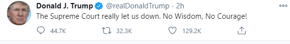 得此噩耗,还在兴奋中的川普失望至极,怼上了高法:“高级法院真的太让我们失望了。没有智慧,没有勇气!”