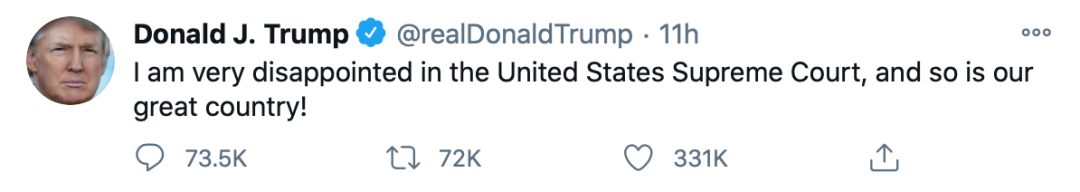 众叛亲离中,川普继续逆风“裸奔”,用推特治国,称“我个人,和伟大的美国,都对最高法院感到失望!”