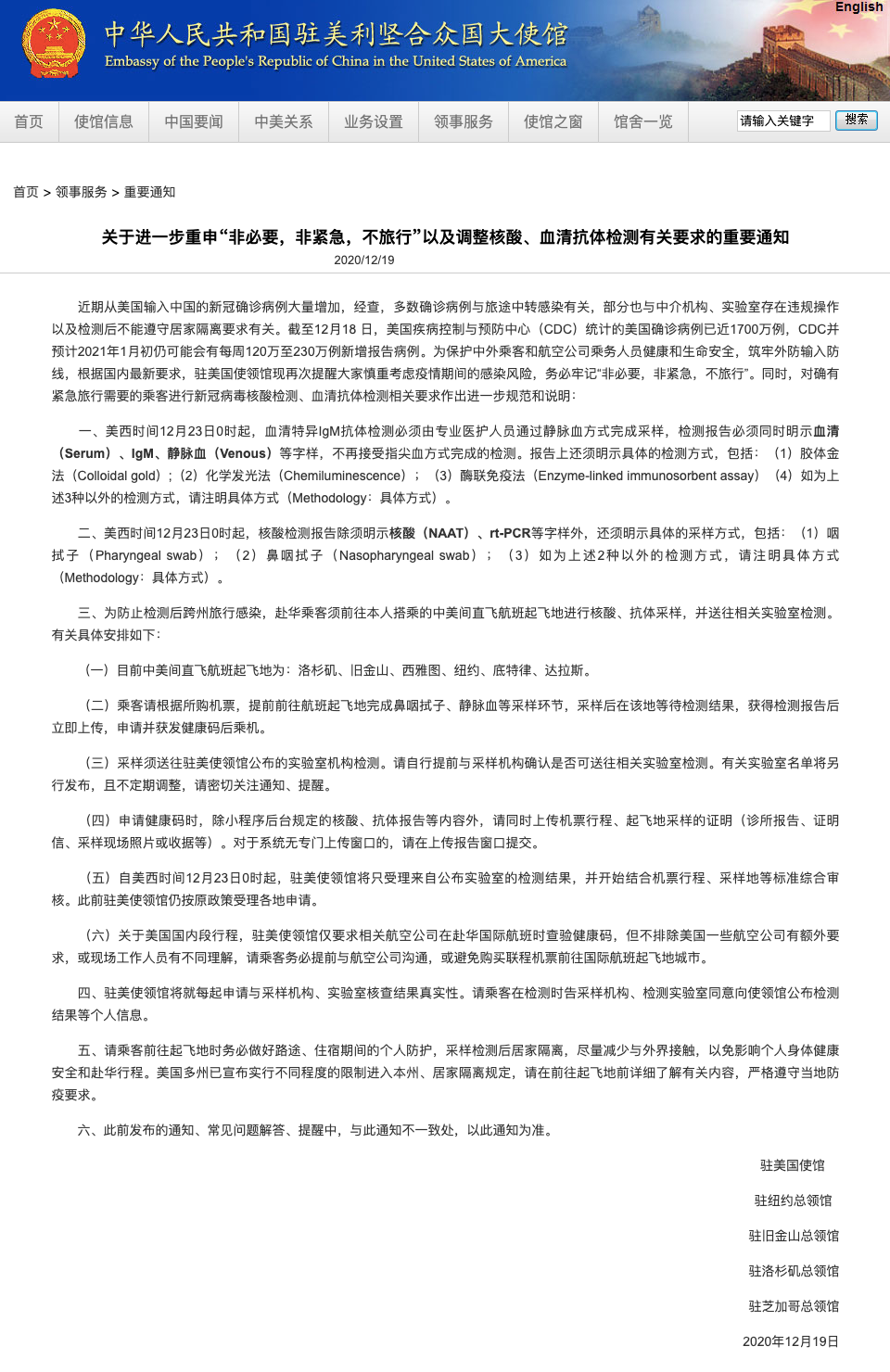 【回国新规】12月23日开始实施!中国驻美大使馆发布核酸抗体检测新要求