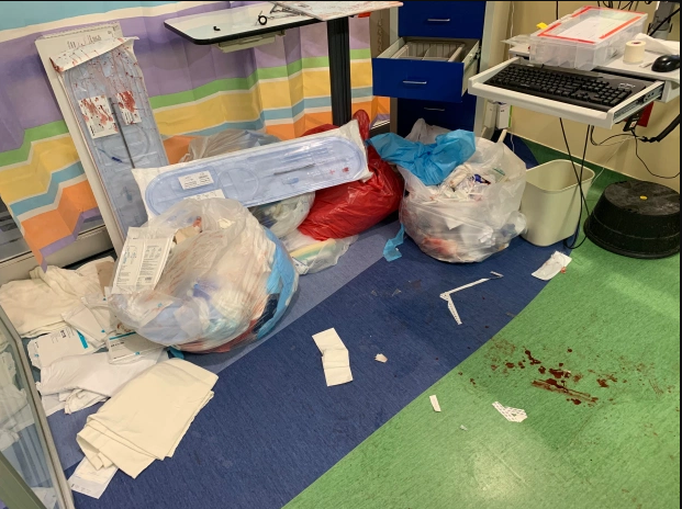 医护人员为他急救期间,男孩肺部的积血喷出,溅满病房的墙壁、仪器以及医生的身上,画面震撼,让人心碎到不忍再看…