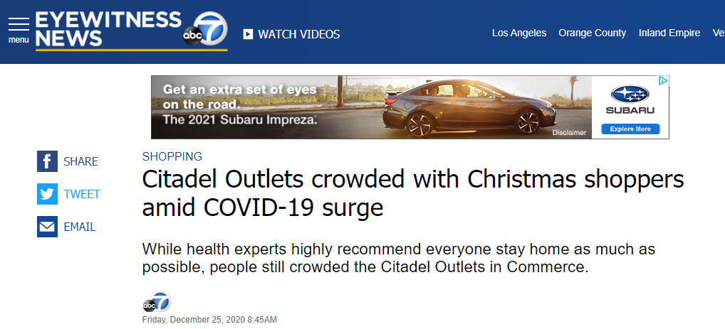 美西时间12月25日,据ABC报道,随着新冠病毒继续像野火一样在加州蔓延,数百万加州人被要求留在家里,而不是在假期拜访朋友和家人。但这并没有阻止居民涌向购物中心,圣诞节期间,城堡奥莱(citadel outlets)依然是人满为患,这是自新冠大流行开始以来最严重的购物高峰,创造了一个新的引爆点。
