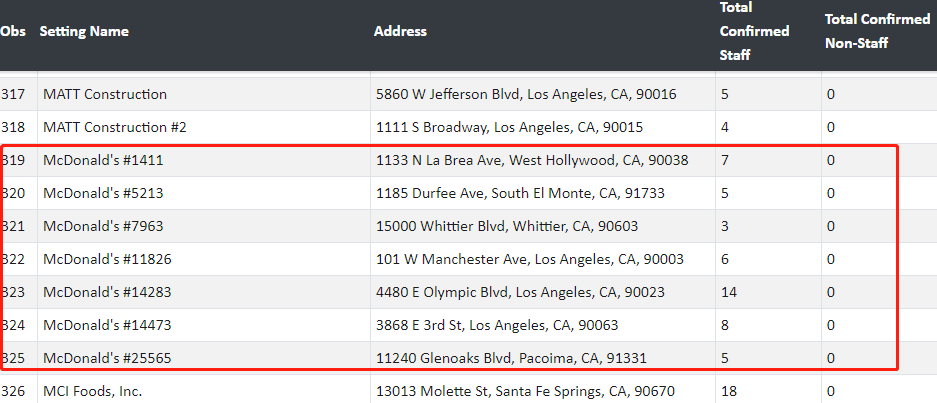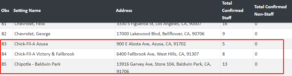 美西当地时间12月21日,据洛杉矶县卫生部门最新数据显示,洛杉矶地区疫情反弹严重,多家著名餐馆和超市员工确诊。居家令期间,洛杉矶县户外堂食被取消,只能允许外卖和派送,其中Chick-Fil-A 、Chipotle、In-N-Out等由于物美价廉经常被华人光顾,但据最新数据显示,位于洛杉矶县境内的多家分店都爆发疫情,食品安全再引担忧…