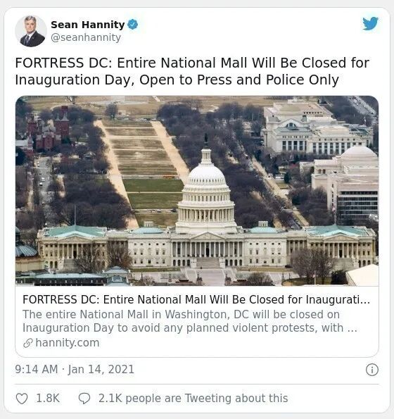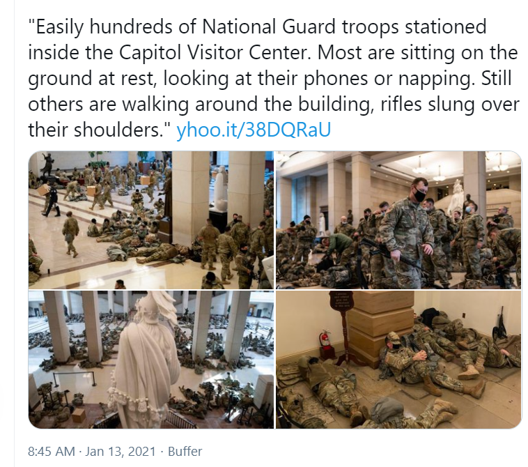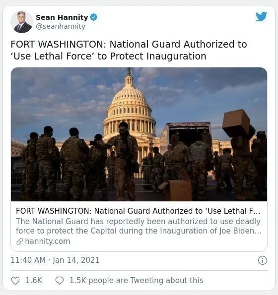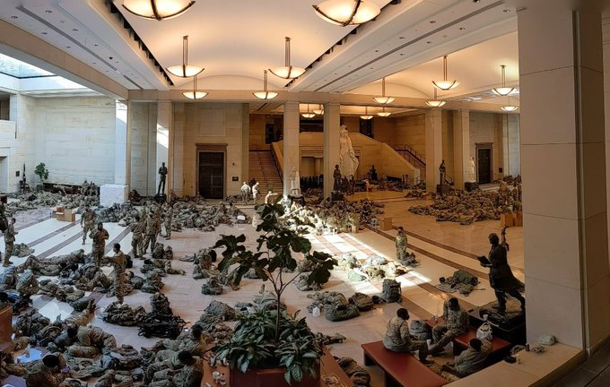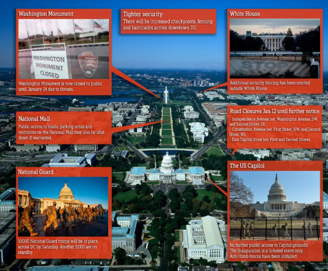 目前,华盛顿已经戒严,多个重要地点全部关闭,大批国防军驻扎。