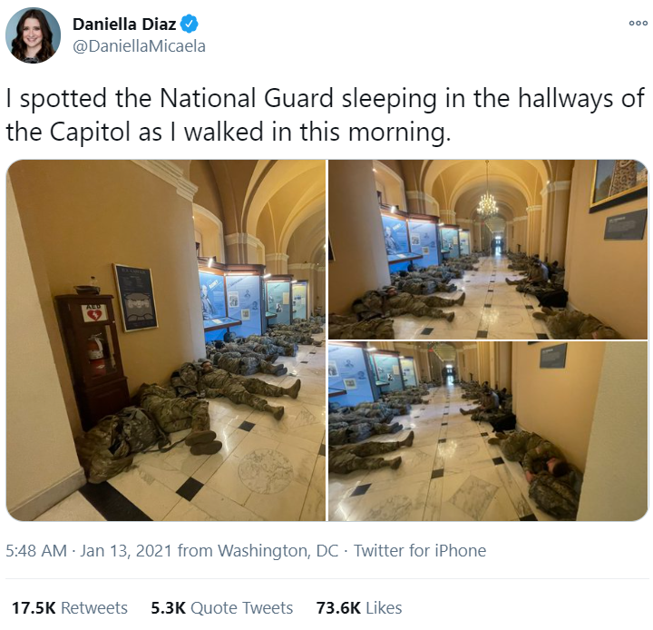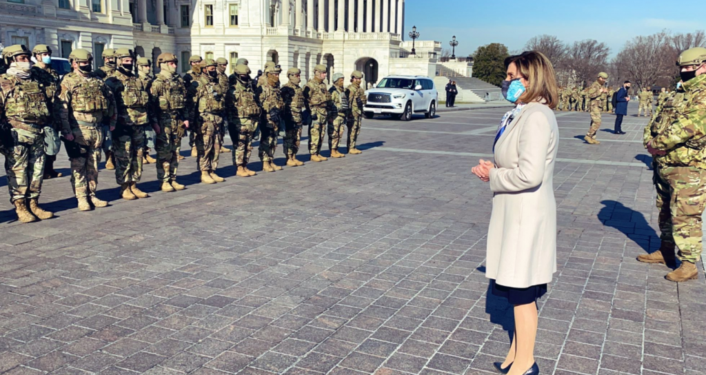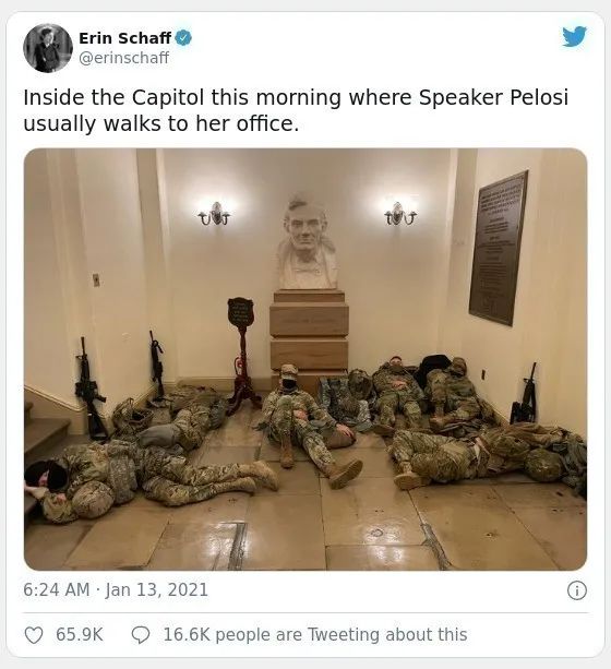 洛西的副幕僚长德鲁•哈米尔13日在推特上发文称,“众议院议长感谢国民警卫队队员保护美国国会大厦。