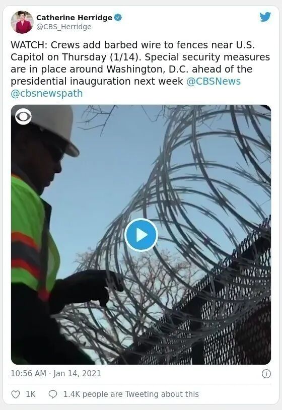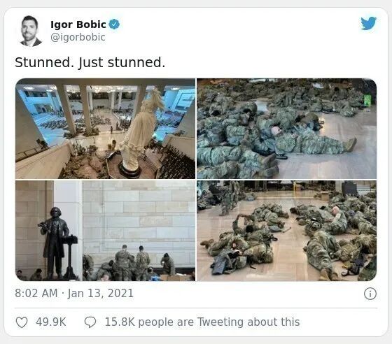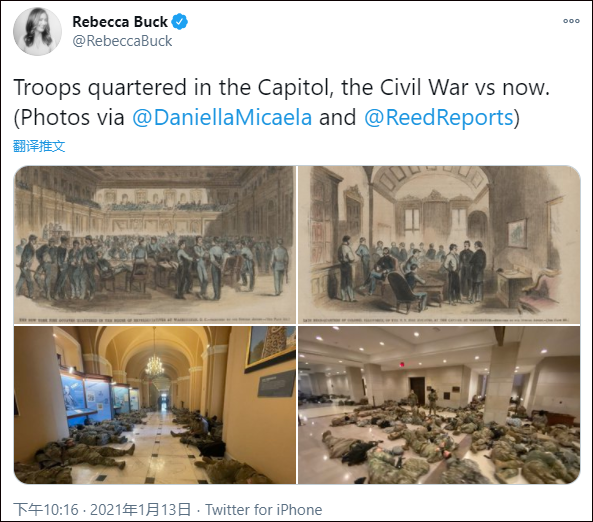 美国有线电视新闻网(CNN)记者则在13日的推文中,将美国内战和如今的照片拼在一起,写道:“士兵驻守在国会大厦,内战 vs 现在。”