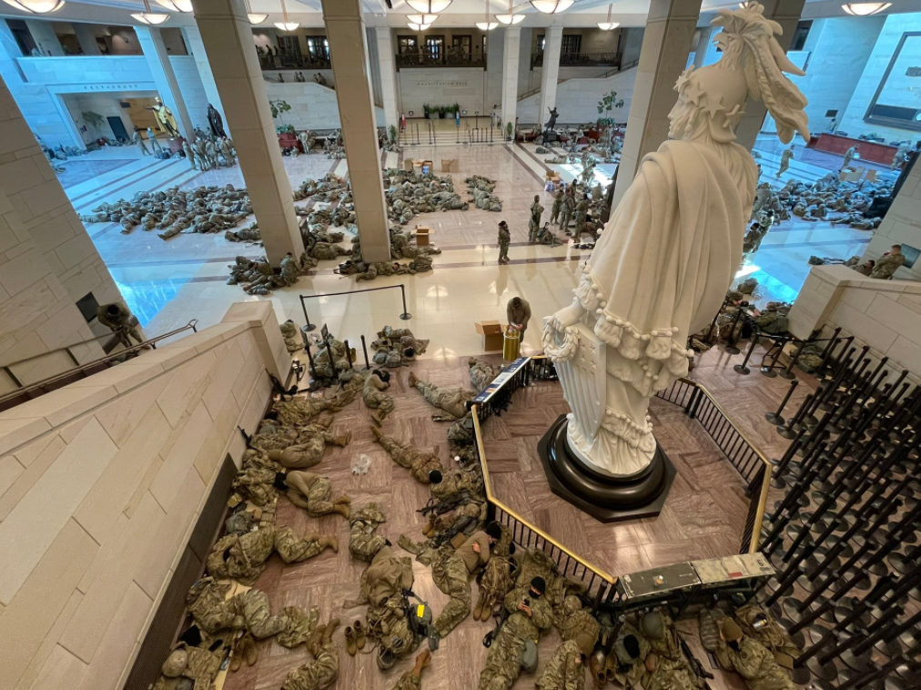 美国人哪里在首都见过如此阵仗!美国彭博社在报道中称,国民警卫队士兵在国会彻夜守卫的场景,如同“内战”爆发一般。
