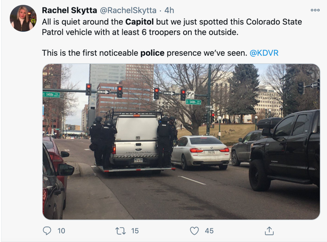 在德克萨斯州议会大厦,本·霍克(Ben Hawk)带着大约十二名示威者走到上锁的大门,手中拿着扩音器和悬挂在迷彩裤侧面的AR-15步枪。他谴责了美国国会大厦的起义。