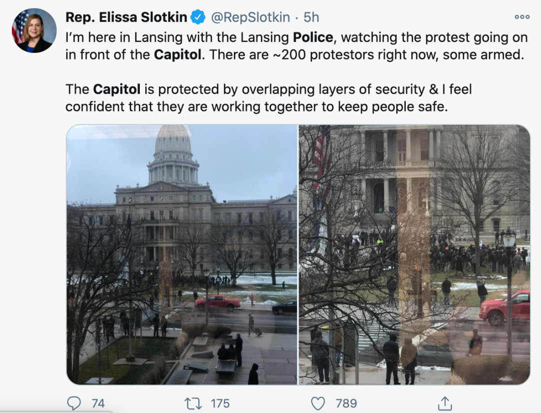 在密歇根州议会大厦外有大约20名抗议者,包括一些武装人员。