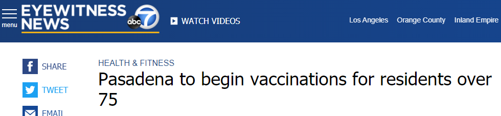 帕萨迪纳市表示,随着疫苗供应的增加,接种资格将扩大到65岁及以上的人。加州已经向65岁及以上的居民开放了疫苗接种资格,但许多地方司法机构表示,他们目前没有足够的疫苗来为这些人接种。