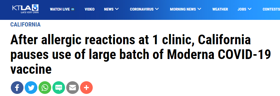 加州流行病学家埃里卡·潘博士(Erica Pan)说:“据报告,在这个社区疫苗诊所使用的Moderna疫苗,引发的过敏反应数量高于正常水平。”