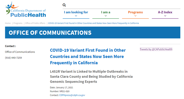 根据加州公共卫生部门(CDPH)的一份新闻稿称,这种新冠病毒变种在加州被检测到的频率越来越高,并在圣克拉拉县(Santa Clara County)的几次大规模疫情爆发中被发现。