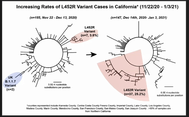 病毒学家查尔斯·邱(Charles Chiu)博士过去几个月在加州大学旧金山分校(University of California, San Francisco)对来自全州多个县的病例进行了测序。他表示,在新冠病例病毒样本中发现了越来越多的L452R。