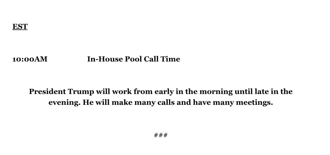 美国哥伦比亚广播公司(CBS)报道,白宫已发出“邀请函”,邀请人们参加特朗普20日早在安德鲁斯联合基地的“告别仪式”。此外,多名驻白宫记者在推特上分享了特朗普19日的日程,日程中写道:“特朗普总统会从早工作到晚。他会打很多电话,开很多会议。”
