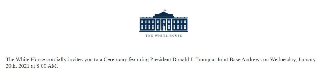 邀请函中称,特朗普的“告别仪式”将于20日早上8时举行,每人可以带5名客人,并且在活动期间须戴口罩。据悉,这场告别仪式上,特朗普将鸣21响礼炮、奏军乐和走红地毯。