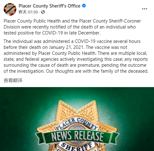 与此同时,本周末,一名北加州Placer County 的居民在接种新冠疫苗几小时后离世。