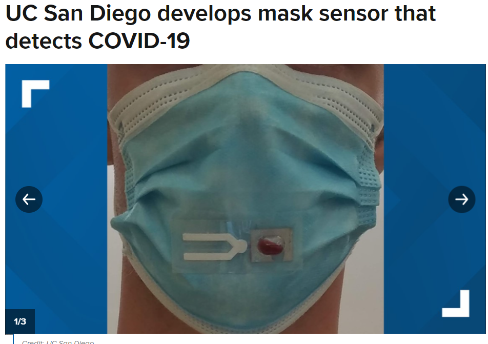 本周加州大学圣地亚哥分校(University of California San Diego)的研究人员正在研发一种新型口罩,可以通过呼吸或唾液,检测佩戴者是否感染新冠病毒。
