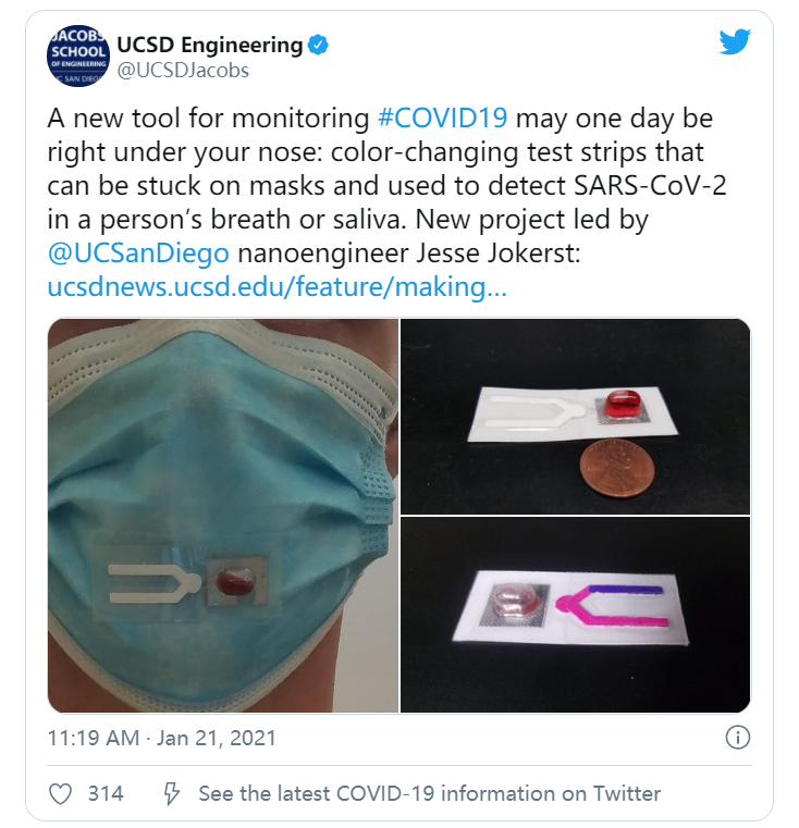 UCSD 工程学院纳米工程教授、该项目的首席研究员杰西·乔克斯特表示:“通过佩戴口罩,就能快速识别人们是否感染新冠病毒,从而最快最大程度保护到其他可能与之接触的所有人和整个社区的安全。”