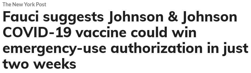 据报道,强生疫苗有望在两周内获得FDA批准,成为全美第三种获批新冠疫苗。