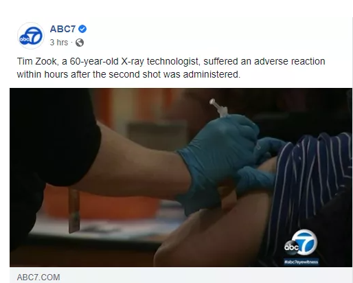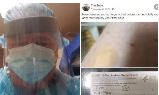 这名X光操作员名叫Tim Zook,今年60岁,是一名一线医护人员。他的家人指出,Zook有高血压和轻微的肥胖,他是接种疫苗的支持者。