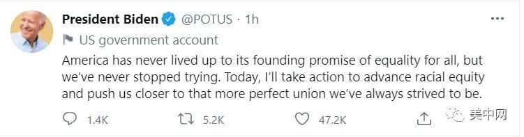 拜登在签署行政令后发推特说,“今天的行动是促进种族平等和实现我们国家诺言的重要的第一步。”