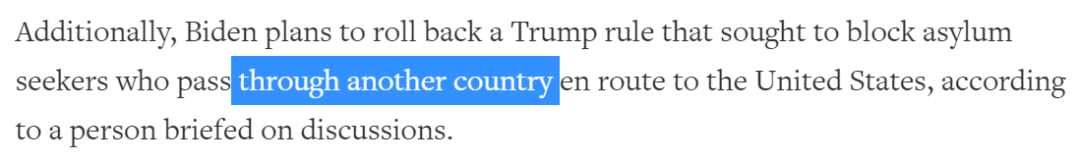举例来说,如果庇护申请者离开故乡之后,前往美国途中曾经通过第三国,却没有向第三国先行申请庇护,则失去庇护申请资格。