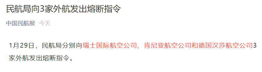 根据通报, -1月18日瑞航LX188(苏黎世至上海)5人确诊; -1月19日肯航KQ882(内罗毕至广州) 5人确诊; -1月19日德国汉莎LH728航班(法兰克福至上海)5人确诊。 以上航班都需熔断两周。