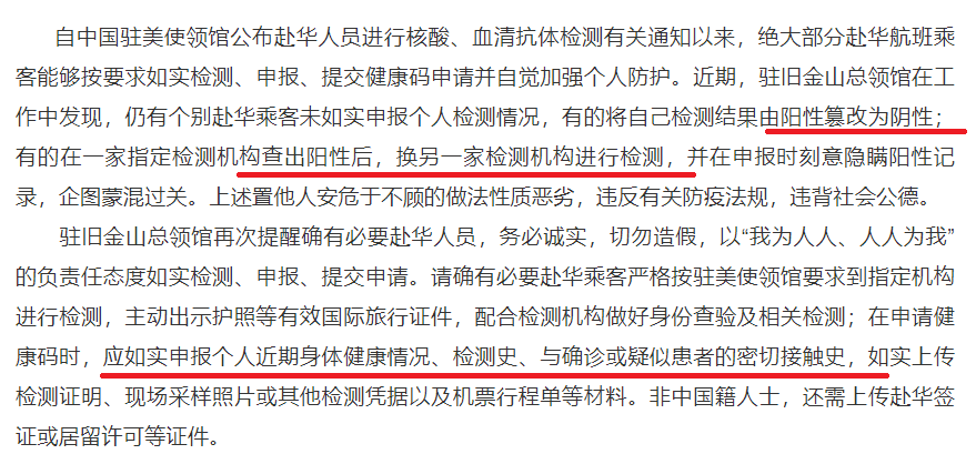 (五)有易感染的基础疾病的:有基础疾病人员为感染高风险人群,建议待疫情缓解后旅行,或在寻求医生建议,经确认可在疫情期间旅行后,再进行“双检测”。 六、总领馆将逐一对入境后确诊个案进行倒查。对在全量核查或倒查中发现涉及到当事人责任的,航司将拒绝登机,有关部门将追究法律责任。涉及到采样、检测机构问题的,将取消其指定资格。