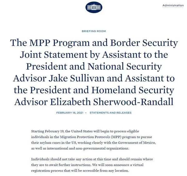 2月16日,白宫发表声明:“从2月19日开始,美国将开始与墨西哥政府、国际组织和非政府组织密切合作,处理符合移民保护法案(MPP)计划的、在美国申请庇护的个案。”“个人目前不要采取任何行动,应留在原地,等待进一步指示。”“我们将很快宣布一个在线注册程序,从任何地方都可以登陆。”