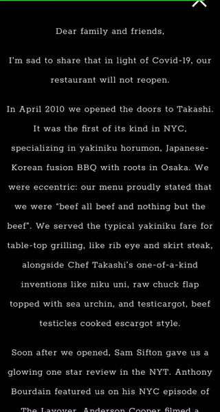 店主Saheem Ali更是在网站上留下沉重的《告公众书》,抱憾表示,从今往后,这家10年老牌餐厅Takashi,曲终人散,将不再为食客,留下那盏明灯。 (图片来自eater NY,版权属于原作者)