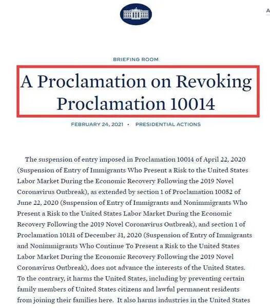 拜登放宽政策 移民签证恢复2021年2月24日,白宫网站上发布公告,拜登撤销第10014号公告、10052号公告第一节、10131号公告第一节,允许绿卡申请人入境。