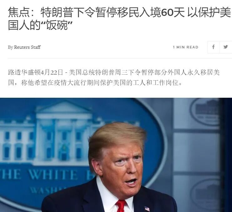川普此前行政令:禁止移民入境2020年4月22日,在新冠疫情爆发之后,川普为保护美国医疗资源、保护美国工人工作机会,签署行政令暂停接受移民、暂停移民入境60天、禁止海外地区核发绿卡。