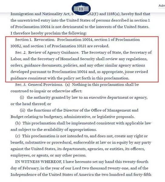 公告指出,美国国务卿、劳工部长和国土安全部部长应审查根据第10014号公告制定的所有法规、命令、指导文件、政策和任何其他类似的机构行动,并酌情发布与本公告规定的政策一致的修订指导。