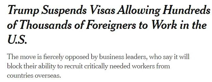 2020年6月22日,川普将移民禁令延长至2020年底,扩大禁令范围,暂停签发H-1B、L-1、H-2B与部分J-1等短期非移民工作签证。