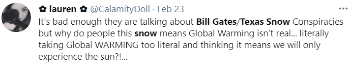“他们谈论比尔盖茨和得克萨斯的降雪阴谋已经够糟糕的了,但是为什么人们说这场雪意味着全球变暖不是真的……”