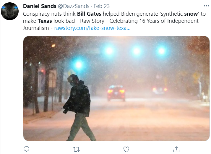 就在这些“阴谋论者”声称最近席卷得州的大雪是假的时候,