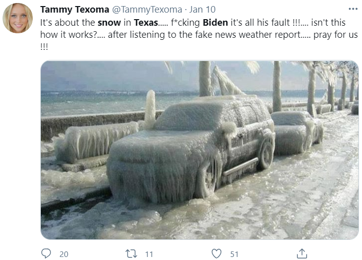 “这是得州的雪…F*c…都是拜登的错!!要不是他得州哪儿能变成这样?”