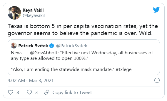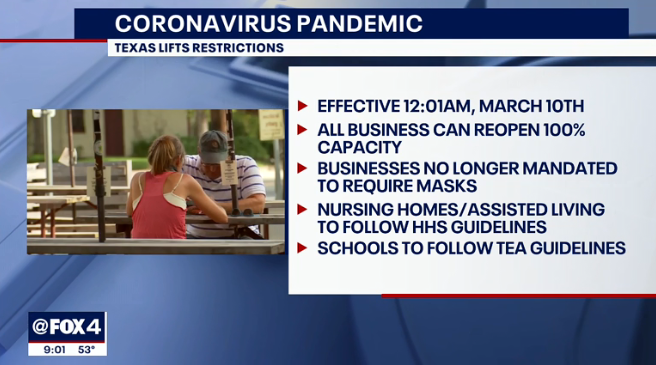 州长Abbott声称:“ COVID并没有消失。它仍然存在于德克萨斯州,美国和全球。但是从恢复,疫苗接种和住院率可以明显看出,我们不再需要国家强制执行的命令。”