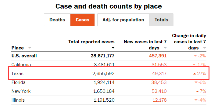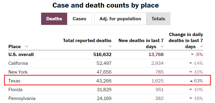据华盛顿邮报统计,德州累积确诊人数累积2655592,全美第2,1周内涨了27%。