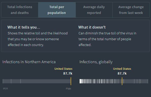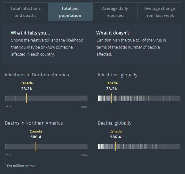今天,路透社对比了美加两国的确诊和死亡数据。每100万人中,加拿大有23.3K人感染,586.4人死亡;。而每100万人中,美国感染人数为87.7K,以及1.5K人去世,稳居北美榜首。