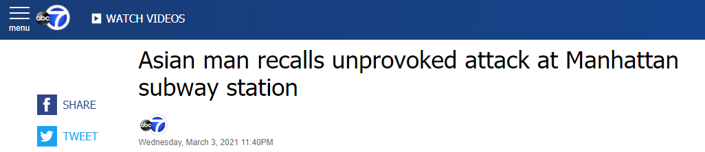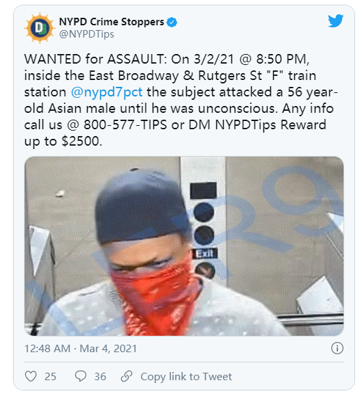 56岁亚裔男无故遭袭!就在F车东百老汇地铁站 嫌犯在逃