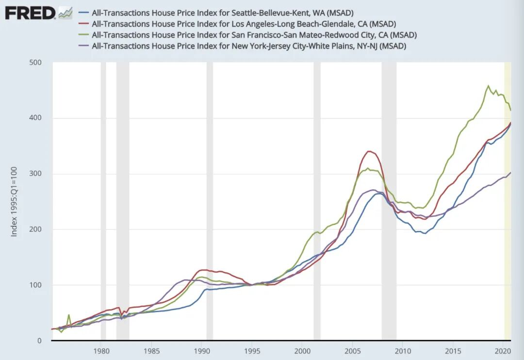 纽约(紫)、洛杉矶(红)、旧金山(绿)、西雅图(蓝) 房价对比 1975-2020