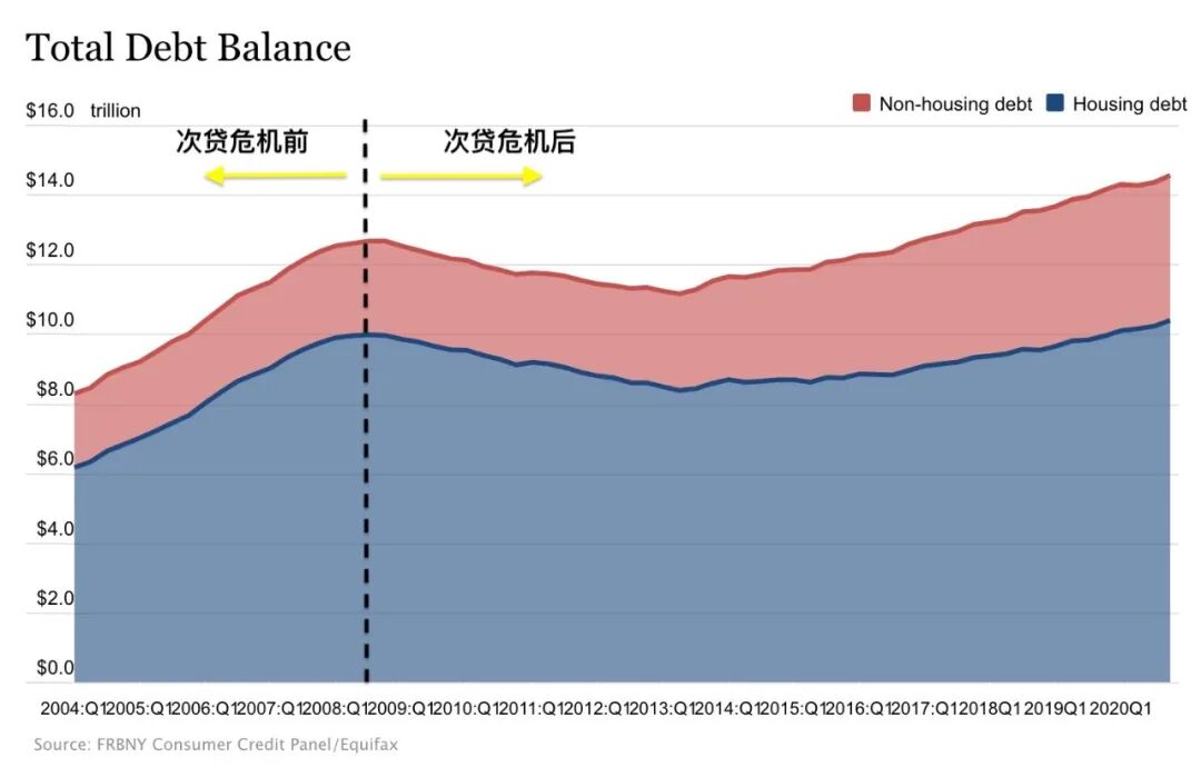 我们直接再看看居民杠杆率中的分子,也就是美国居民总债务。下图中蓝色部分为房贷存量、红色部分为债务中的非房贷存量。可以看出,次贷危机之前这两项债务存量快速增长,次贷危机后,经过长达五年的出清才开始恢复增长。直到现在,居民债务的增值都是相对缓慢的。目前美国房贷存量杠杆达到次贷危机时的最高水平,而同期美国GDP增长了43%。
