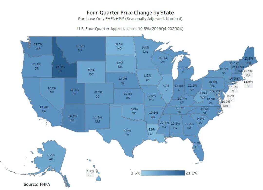 近日,美国联邦住房金融局(FHFA)更新了美国2020年第四季度以及12月的房价数据,至此,FHFA已公开了2020年完整的全美各地房价数据,这个数据的权威性就好比中国国家统计局每个月发布的70城房价数据一样。
