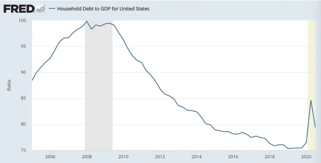 看房价泡沫,就要看整体的居民杠杆率,自2008年次贷危机以来,美国居民部门杠杆率不断下降,直到2019年底。2020年美国居民杠杆率在二季度突然上升,但在第三季度又大幅下降到79%,出现这种数据大幅波动的原因不是美国人突然增加借贷然后又突然还清,而是美国GDP这个分母在2020年第二季度突然下降,到了第三季度又开始快速恢复。因为居民杠杆率 = 居民总负债/GDP,所以GDP这个分母的大起大落会影响到居民杠杆率的具体数字。