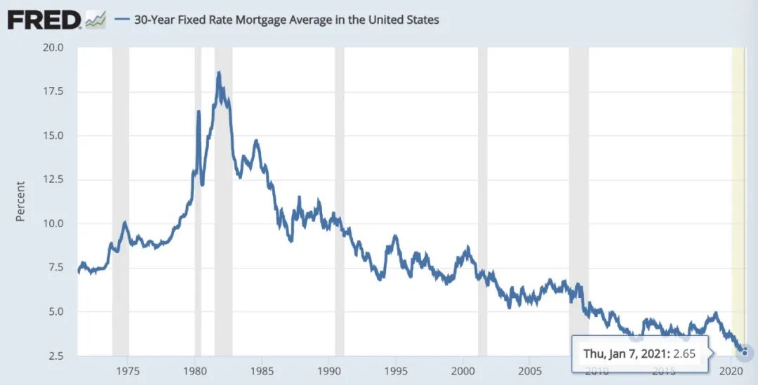 我们上面提到了,最主要的原因是美联储放水。在美联储的无限量化宽松之下,市场利率大幅下降,30年固定的房贷利率在2021年1月7日是跌到了2.65%,这是前所未有的低利率,这种利率的贷款对于买房者来说不借白不借,买到就赚到。要知道,在2018年美国走完前一轮加息周期之后,30年期房贷利率还曾经接近5%,在1980年代,最高接近20%(所以那会儿大多数人都是全款买房),现在只要2.65%。