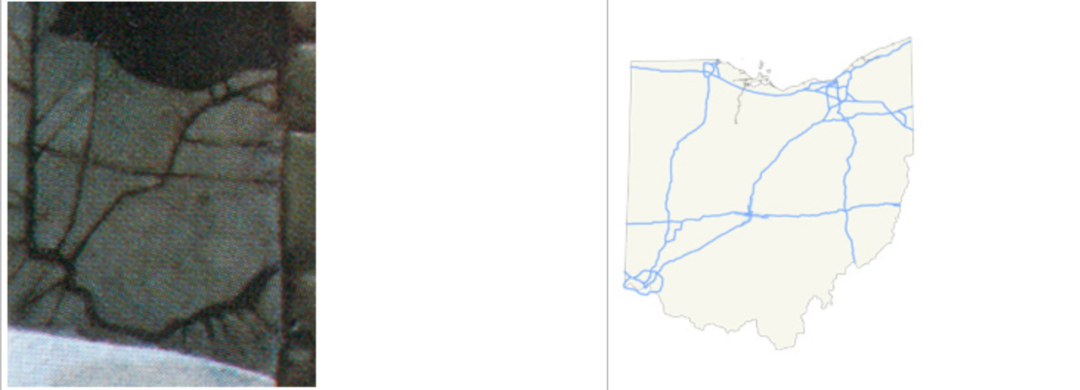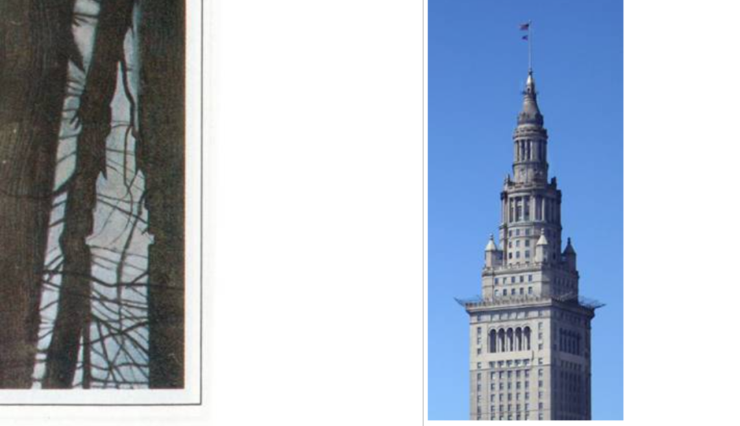 左上角的树木之间有一个楔形间隙。旋转180度(如下图所示),它形成了克利夫兰航站楼的轮廓。