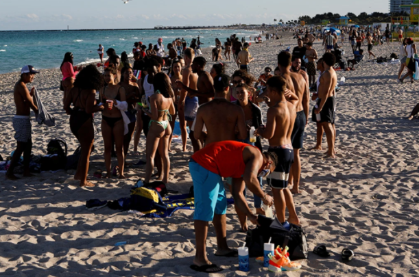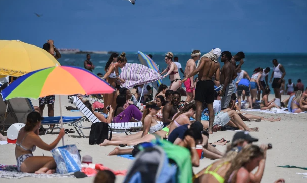 在佛罗里达的春假热门目的地,大学生们穿着比基尼在沙滩上嬉戏,但却看不到有人口罩。外州游客的激增,迫使劳德代尔堡的一个热门景点要禁止23岁以下的游客入境。