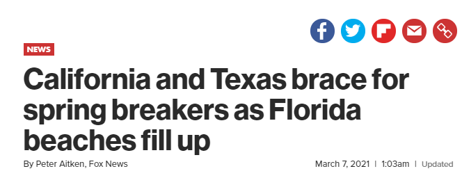 在佛罗里达海滩挤满了年轻人的照片和视频淹没了社交媒体后,德州和加州也敦促春假游客重新考虑新冠肺炎病例激增的计划。