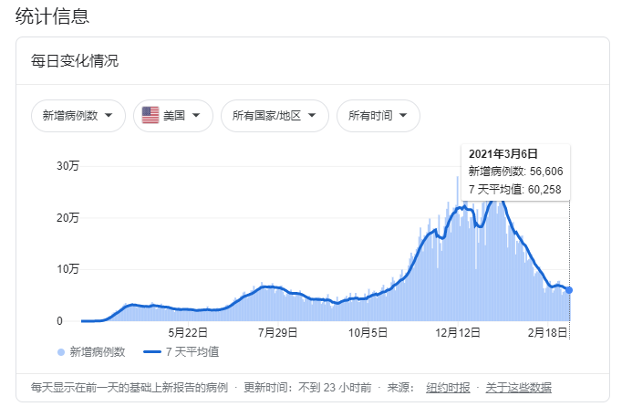 《纽约时报》数据库显示,截至周五(5日),全美新增病例7日平均值约为6.1万例,系2020年10月以来的最低平均值。