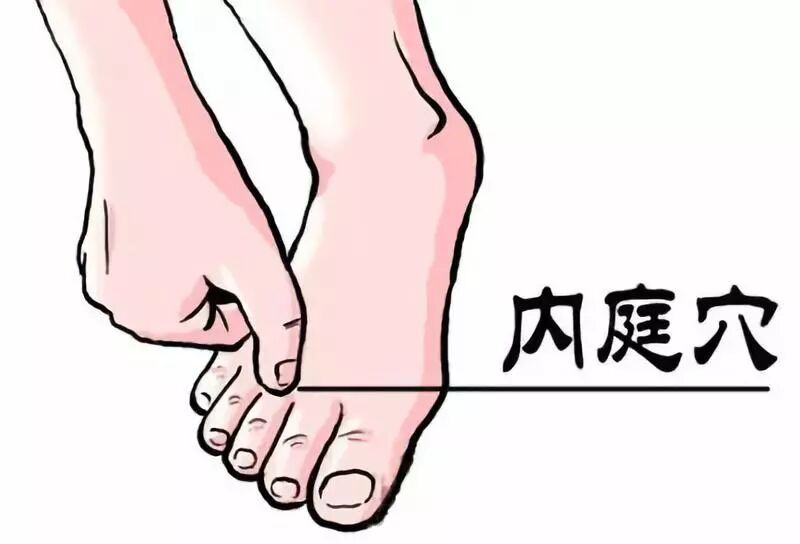 内庭穴处于脚背第二和第三个跖骨接合凹陷的地方。具有除口臭、治牙齿疼痛的效果。